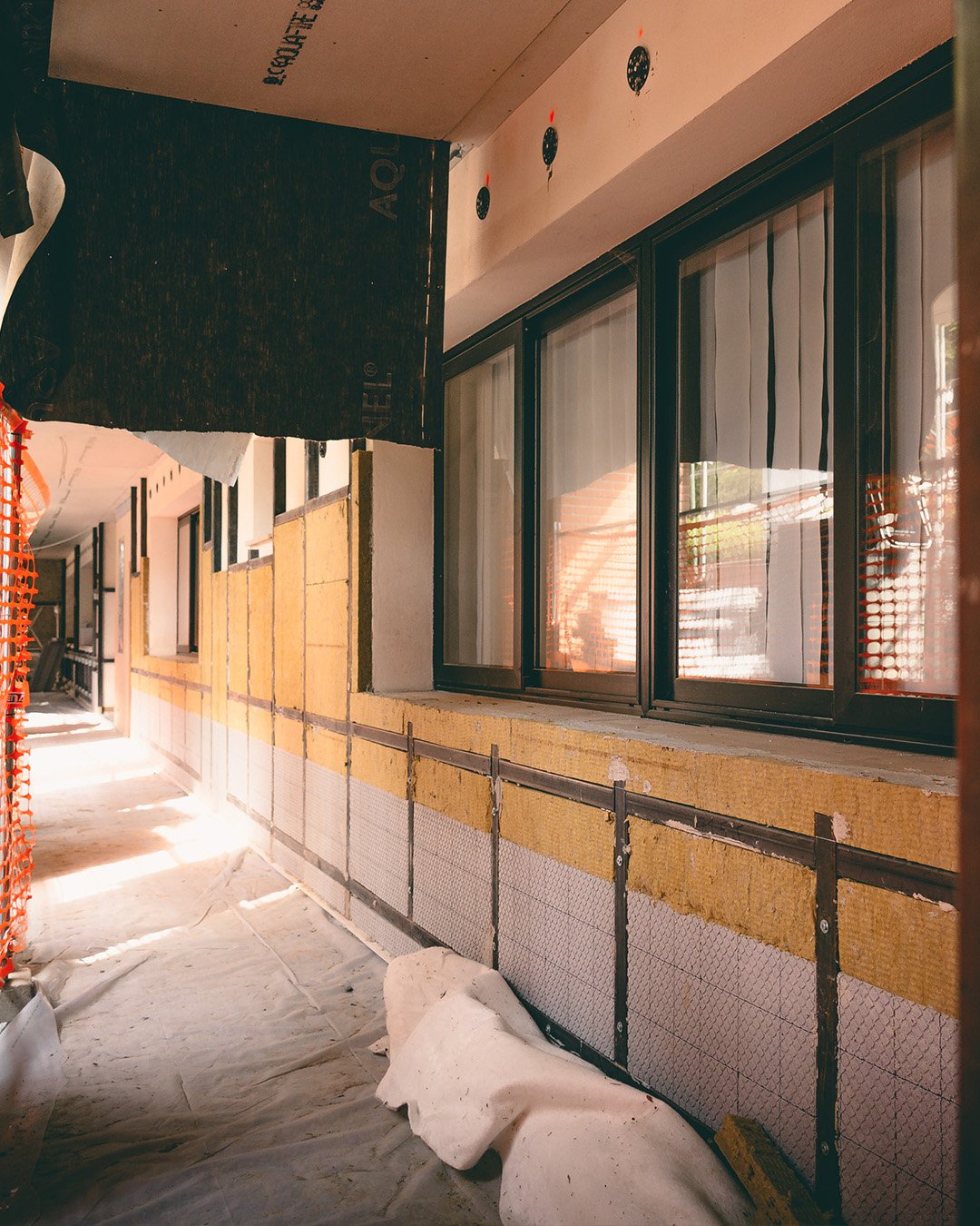 - Facciate: isolamento con sistema prefabbricato in fibra-cemento e isolante termo riflettente (8 cm), rivestimento in intonaco.